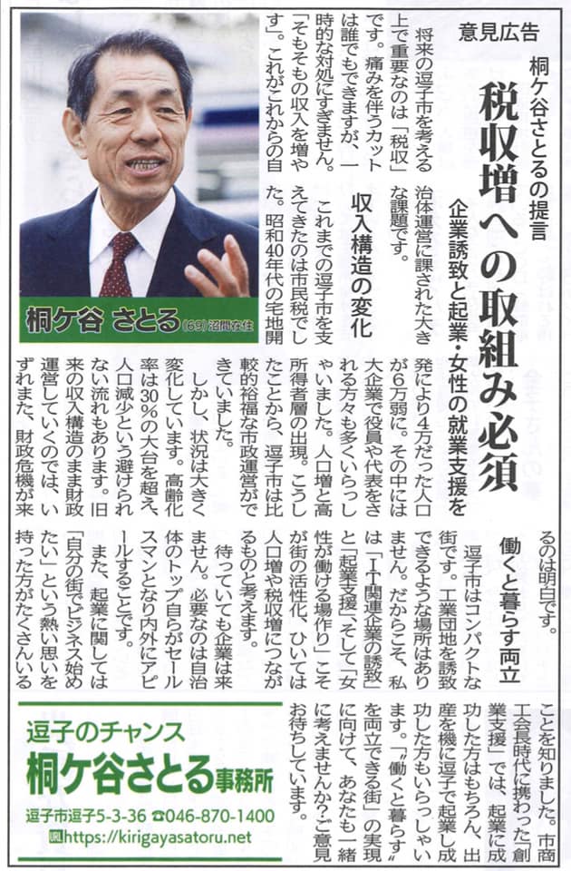 タウンニュース逗子葉山版に意見広告 No.2 投稿日 2018年11月2日 更新日 2020年3月6日 著者 kirigaya カテゴリー タウンニュース カテゴリー トピックス - シェア - ツイート 2018年11月2日発行のタウンニュースに意見広告を掲載しました。 逗子市にとって大切な税収や起業・就業支援などについて書きました。ご一読いただけましたら幸いです。 桐ケ谷さとるの提言 意見広告 税収増への取組み必須 企業誘致と起業・女性の就業支援を | 逗子・葉山 | タウンニュース将来の逗子市を考える上で重要なのは「税収」です。痛みを伴うカットは誰でもできますが、一時的な対処にすぎません。「そもそもの収入を増やす」。これがこれからの自治…www.townnews.co.jp タウンニュース逗子葉山版 2018年11月2日発行 - シェア - ツイート この記事を書いた人 kirigaya 桐ケ谷覚(きりがやさとる) 第9代 神奈川県逗子市長 10年後、20年後、30年後も未来への希望のある逗子へ! 記事一覧